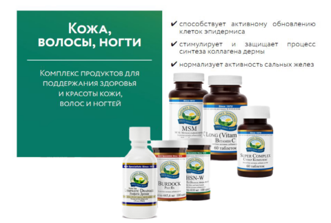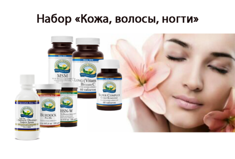 Компания NSP подготовила набор продуктов, способных дать нам необходимые ресурсы для поддержания здоровья и красоты кожи и призванных усилить эффект от средств по уходу и косметических процедур. Вот основные задачи, которые реализует набор продуктов «Кожа, ногти, волосы»: