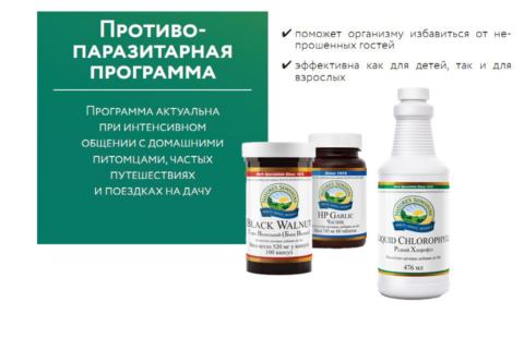 Компания NSP представляет новый набор для профилактики и эффективной борьбы с паразитами. «Противопаразитарный» набор основан исключительно на натуральных ингредиентах, спектр действия которых значительно шире, чем у синтетических веществ. Курс приема у натуральных продуктов дольше, но зато благодаря отсутствию токсического эффекта лучше всего подходит для лечения и профилактики всех возрастных групп, начиная с маленьких детей и заканчивая пожилыми людьми. Непрошенным гостям противостоят три топовых продукта из ассортимента компании NSP: Черный грецкий орех, Чеснок и Жидкий хлорофилл. Black Walnut. Не зря под орехами не растут грибы, и насекомые особо не жалуют растение. Вещества, содержащиеся в листьях дерева, обладают широким спектром воздействия на все виды гельминтов: плоских червей, сосальщиков, лямблий, многоклеточных паразитов и круглых червей. Губительное воздействие черный орех оказывает и на грибки, подавляя их жизнедеятельность. Кроме того, экстракт кожуры оказывает укрепляющее действие на иммунную систему, обогащая ее витаминами С, PP, B1 и B6. HP Garlic. Второй противопаразитарный продукт – так любимый украинцами в борще, пампушках и как дополнение к салу – чеснок. Еще с давних времен пахучий овощ спасал людей от инфекций, цинги и паразитов. Сегодня мы знаем о нем еще больше и стали ценить еще и за эффективного помощника для сердечно-сосудистой системы. В отличие от свежего чеснока, которого много не съешь без риска заиметь проблемы с желудком, продукт NSP благодаря капсуле из хлорофилла будет усваиваться исключительно в тонком кишечнике, сохраняя свою активность и не вызывая спазмы и раздражение в желудке. Chlorophyll Liquid. Для обезвреживания и выведения из организма продуктов жизнедеятельности и распада паразитов в набор включен Жидкий хлорофилл.